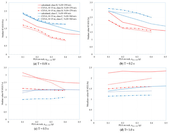 Non-linear effects are more important for sites with low Vs30 and smaller amplifications can be observed, specially for larger PGA values (Figure 16). It can be noted from Figure 16c,d that for softer soils (class D sites), higher amplification factors are obtained at longer periods of T = 0.5 s and 1.0 s. By contrast, for stiffer soils (class C sites), relatively lower amplification factors are obtained for shorter periods of T = 0.01 s and 0.2 s. Similar variation of the amplification factors as a function soil site class are reported in recent literature [44,55,56,57]. Akkar et al. [55] formulated new ground motion prediction equations for Europe and Middle East by including non-linear site amplification function that is a function of Vs30 values from 150 to 1200 m/s and reference peak ground acceleration. Bindi et al. [56] observed it from their 1-D ground response analyses that site class A (rock) dominates the site-to-site variability for short site fundamental periods while for long periods the difference among the classes is less pronounced, with soil sites (classes C and D). Kotha et al. [57] presented nonlinear curves site amplification factors for periods of T = 0.01, 0.1, 1 s as a function of with Vs30. They observed that short-period site response at rock sites shows high variability compared to softer soils but the long-period site-response of rock sites show less variability than that of softer soils (e.g., 180 m/s ≤ Vs30 < 800 m/s).
