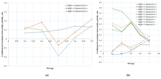 Correlation coefficient between lnFD and lnFC as a function of PGA and RQD (a) for a period of 0.01 s, (b) for periods of 0.2, 0.5 and 1.0 s.