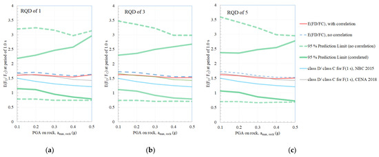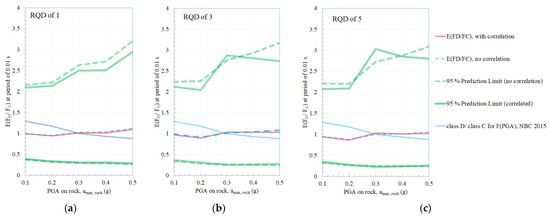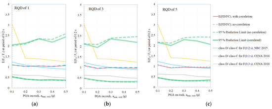 Comparison between (FD/FC) at T = 0.01 s and the site factors in NBCC (2015) for RQD of 1 (a), 3 (b) and 5 (c).