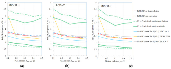 Comparison between (FD/FC) at T = 0.5 s and the site factors in NBCC (2015) and the CENA site factors published by Hashash et al. [11] for RQD of 1 (a), 3 (b) and 5 (c).