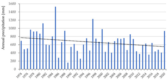 The analysis was performed using a database comprising data from the National Water Agency (ANA) [23], from seven meteorological stations in the region to calculate the median value. The meteorological stations with data from 1974 to 2020 are: Lençóis (station code 83242; latitude: −12.557854; longitude: −41.388808), Morro do Chapéu (station code 83184; latitude: −11.547494; longitude: −41.151165), and Ibotirama (station code A439; latitude: −12.19305555; longitude: −43.21333333). The meteorological complementary stations with data from 2008–2020 are: Brumado (station code A433; latitude: −14.18194443; longitude: −41.67222221), Irece, Itaberaba (station code A408; latitude: −12.52416666; longitude: −40.29972221), and Vitória da Conquista (station code A414; latitude: −14.88638888; longitude: 40.80138888). The individual analysis of these stations indicates certain data variability that might result from the topography in the area. The meteorological data in the Chapara Diamantina region indicate a high volume of rainfall in the region but also a significant number of days without rain. These data show the climatic variability of the concentration of rain in a few periods compared to long periods of drought, which heavily impacts local agriculture. The annual precipitation has a decreasing tendency. The year 1989 stands out as a year of low rainfall, with 160 mm of rain (see Figure 2).