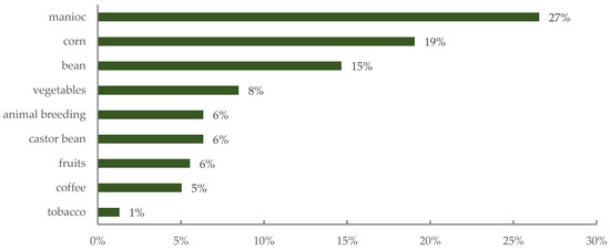 The survey results are divided into five subjects: (i) natural hazards, (ii) health, (iii) social, (iv) income, and (v) other impacts. The survey respondents were typically (51%) 31–50 years of age, followed by 27% who were 51 years or older, and 20% between 18 and 30 years. Most of the respondents were female (70%). Concerning the residence location, meaning urban or rural, 98% lived in a rural area. Manioc took first place regarding the main cultivated products, followed by corn and bean (see Figure 6).
