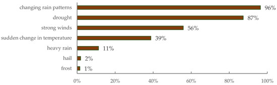 Regarding the phenomenon that most impacts rural activity, changing precipitation patterns (96%) and drought (87%) were the most common extreme natural events that rural producers worry about (see Figure 7). The impacts of drought on the environment are expressed in reducing water and, therefore, production.