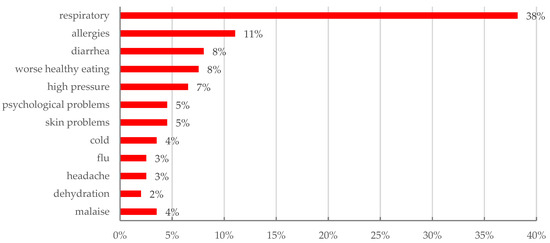 Regarding the drought impacts associated with health, respiratory problems were perceived to be impactful by the most respondents of all different age groups: 20% among those between 19 and 30 years old, 52% between 31 and 50 years old, and 28% for those 51 years or older. Most of the impacts related to drought are respiratory symptoms, diarrhea problems, or allergies resulting from skin irritation as a result of the dry, high temperatures and the number of particles suspended in the air (see Figure 8). This period is also commonly associated with fire occurrence in the region.