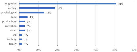Regarding the drought impacts associated with social activities and behaviors, migration aspects are perceived to be impactful for most respondents (51%). The other main impacts are related to income and psychology (see Figure 9). This domestic migration in Brazil is characterized by a flux population caused by low rural incomes, for example to big cities in the Southeast and South of the country or new agricultural frontiers.