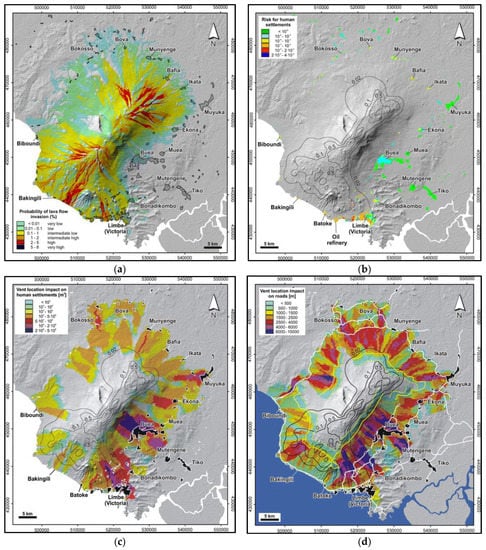 Risk maps of probability of lava flow inundation from Mt Cameroon. (a) Human settlements (b) Vent location impact on human settlements (c) Vent location impact on roads (d) Vent loccation on Mt Cameroon. Source: [].