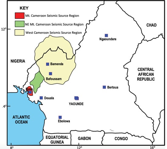 - Ambeh, W.B.; Fairhead, J.D.; Stuart, G.W. Seismotectonics of the Mount Cameroon volcanic region, West Africa. In Volcanic Seismology; Gasparini, P., Scarpa, R., Aki, K., Eds.; Springer: Berlin/Heidelberg, Germany, 1992; Volume 3. [Google Scholar] [CrossRef]