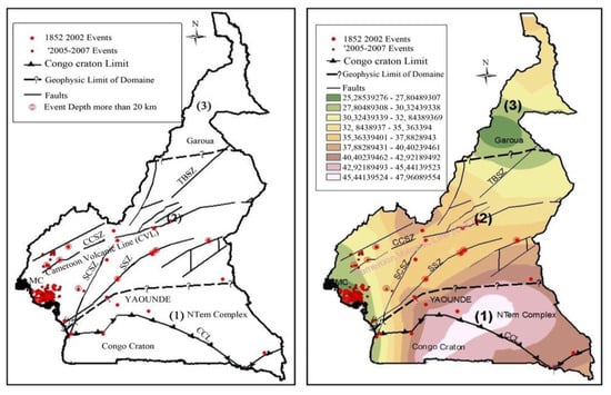 Cameroon is characterized by heterogeneous seismicity where tectonic and volcanic earthquakes are associated with crustal disturbance and volcanic eruptions, respectively. Around 80% of all seismic events in Cameroon occur at shallow depths of less than 10% []. Ndibi et al. [] compiled an earthquake catalogue on the CVL from 1900 to 2010 that shows the biggest magnitude earthquakes above 3.9 Mw (Table 1).
