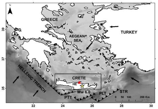 Seismotectonic setting of the study area [,]. Key: rectangle shows the Crete area illustrated in Figure 2 and Figure 3; arrows show lithospheric plate motions; the African (Nubian) lithosphere subducts from the Mediterranean underneath the Aegean Sea at the southern Eurasian plate margin along the Hellenic Trench system e.g., []; PTT, PLT and STR stand for Ptolemy, Pliny and Strabo trenches, respectively; star shows the epicenter of the Mw6.0 27 September 2021 mainshock; red triangle stands for Heraklion (HE), the capital city of Crete.