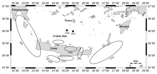 Rupture zones (ellipses) and occurrence years (AD) of the most important historical shallow earthquakes in the Crete area. Ellipses size scales with the estimated earthquake magnitude, M, which ranges from 6.3 ± 0.2 for 1595, to 8.0 ± 0.3 for 1303 and to 8.3 ± 0.3 for 365; M is equivalent to Mw. Epicenters of the most important historical intermediate-depth earthquakes are also illustrated as black circles; magnitudes are 7.6 ± 0.3 for 1856 and 6.6 ± 0.3 for 1870. Figure reproduced from [].