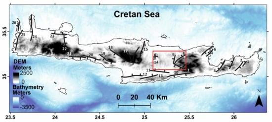 - Caputo, R.; Catalano, S.; Monaco, C.; Romagnoli, R.; Tortorici, G.; Tortorici, L. Active faulting on the island of Crete (Greece). Geophys. J. Int. 2010, 183, 111–126. [Google Scholar] [CrossRef]