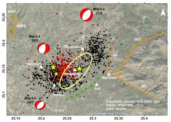 From the long-term perspective it is evident that the seismicity in the Arkalochori area has been very low in the sense that no past strong earthquakes are known there. The long repeat time of strong earthquakes in the study area, estimated on the order of several hundred years, has also been supported by other authors from seismicity statistics e.g., []. Palaeoseismological and historical data indicate that the East Giouchtas Fault is characterized by a surface rupture with an estimated recurrence interval of about 2000 years and slip rate in the order of 0.25–0.5 mm/yr []. Repeat time of strong earthquakes equal to ~800 years has been estimated from tectonic observations on the KF and the Geraki Fault considered together as a single fault zone [].