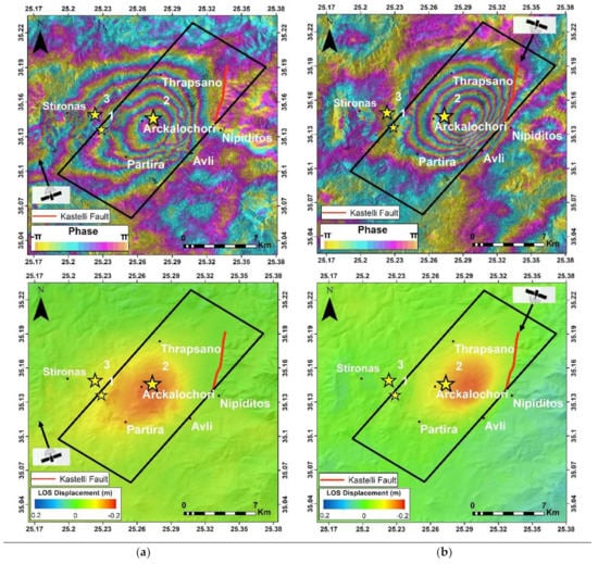 Wrapped interferograms (up) and LOS displacement maps (down) in ascending (a) and descending (b) geometries for the 27 September 2021 earthquake. Symbol key: red line illustrates the surface exposure of Kastelli Fault (KF in Figure 2 and Figure 4); rectangle shows the surface projection of the geodetically determined fault plane (see Section 3.2); stars show epicenters of the largest foreshock of 24 July 2021 (1), mainshock of 27 September 2021 (2), largest aftershock of 28 September 2021 (3); black dots illustrate positions of settlements.