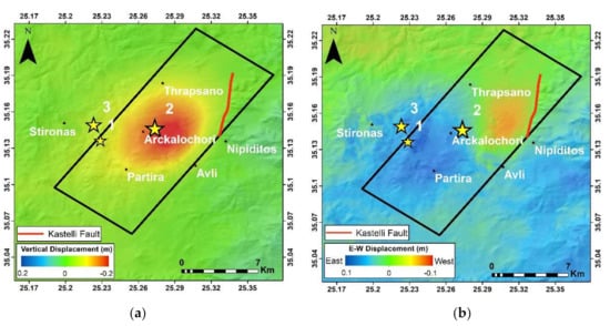 A clear pattern of five fringes forming a relatively small lobe of subsidence is evident in both the wrapped ascending and descending interferograms (Figure 5). From the LOS displacement maps, a ground displacement up to −18 cm has been estimated. Subsidence up to −22 cm has been estimated from the displacement decomposition in the vertical (up-down) direction (Figure 6). However, no uplift displacement was detected. According to the horizontal (east-west) displacement map (Figure 6), a pattern is evident showing an eastward movement (blue color) up to 14 cm to the west of Arckalochori town and westward movement (red color) up to 7 cm to the east of Arckalochori. The horizontal displacement could be attributed to horizontal motion caused by the strike-slip component involved in the focal mechanism of the mainshock.