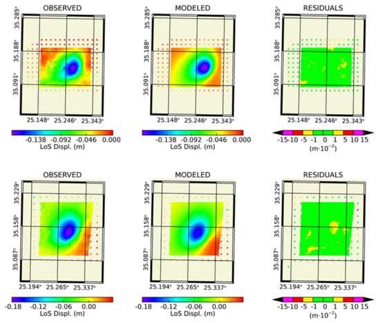 As a final step, geophysical modeling of the seismic fault based on the Okada [] formalism was generated, using the geodetic data derived by LOS ascending and descending displacement products. A number of sampled points from the raster displacement DInSAR maps were used in order to generate the modeled co-seismic signal through Non-Linear and Linear inversions, thus allowing inferring the geometry, kinematics and slip distribution in the seismic fault.
