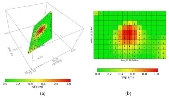 Although the rectangular fault model is more appropriate for earthquakes of M > 6.0, we considered this case too for reasons of comparison. The fault dimensions have been taken from only the first three-day aftershock activity aiming to avoid overestimation of the seismic slip area. Namely, the fault length is ~9 km and the lateral width is also ~9 km (Figure 4). However, taking into account that the upper limit of the seismic fault surface is at depth 5 km and the average fault dip is 43° (Table 2), the down-dip width has been found equal to 12.3 km. For seismic moment Mo = 1.1 × 1018 N·m determined from moment tensor solutions, e.g., by GEOFON (https://geofon.gfz-potsdam.de/data/alerts/2021/gfz2021sxyu/mt.txt; last access 9 December 2021) stress-drop Δσ~7 bars has been calculated.