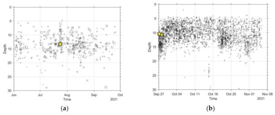 Focal depth versus time for foreshocks (a) and for aftershocks occurring up to 5 November 2021 (b). Stars show the largest foreshock of 24 July 2021 (a), as well as the main shock of 27 September 2021 and the largest aftershock of 28 September 2021 (b).