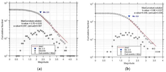N is either the discrete frequency of magnitudes M in each magnitude bin or the cumulative frequency of magnitudes ≥M; α, b are parameters determined by the earthquake catalog data, where b expresses the relative number of the small magnitude earthquakes to the large magnitude ones and α is a measure of the seismicity level. In terms of geophysics, the b-value is considered as a stress meter e.g., []. In this context, low b indicates high material heterogeneity and concentrated stress while high b implies asymmetrically distributed stress.