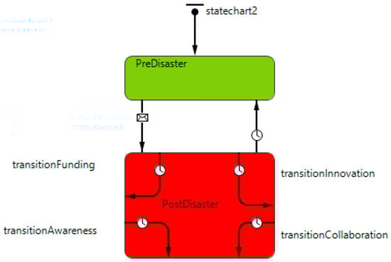 The model captures the top-down interactions between CBOs and the individual family agents. These interactions were captured using four main attributes of CBOs that influence the transformative adaptation of family agents. These attributes, otherwise known as transitions, include innovation, collaboration, awareness, and funding (see Figure 1). The transitions form a link between the CBOs and the family agents, and demonstrate the ways in which CBOs may influence the agents’ variables. Based on empirical data, certain activities within the CBOs in the aftermath of the 2010/2011 earthquakes led to an increase in innovation (via the agents’ knowledge co-production variable), collaboration (via the agents’ leadership and a shared vision for change variables), and awareness (via the awareness initiatives and commitment variables). Funding was likewise seen to indirectly impact on agents’ transformative capacity because these funds provided the resources needed for overseeing the continued running of existing social initiatives and the creation of new ones, which led to an increase in agents’ transformative capacity. The model implemented these interactions using transitions, which created an exchange between CBOs and family agents. Hence, changes in the functions and activities of CBOs create a corresponding change in the capacity of family agents based on the studies within the community. Community initiatives were created and maintained by CBOs based on available funds from the government and external grants. In our model, the funds for each initiative were calculated based on percentages and the average yearly running costs of each initiative. The community initiatives were classified into four groups: