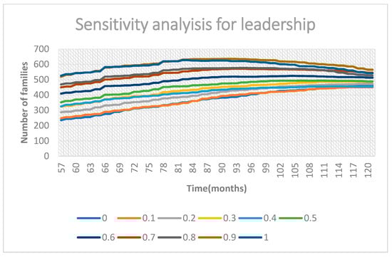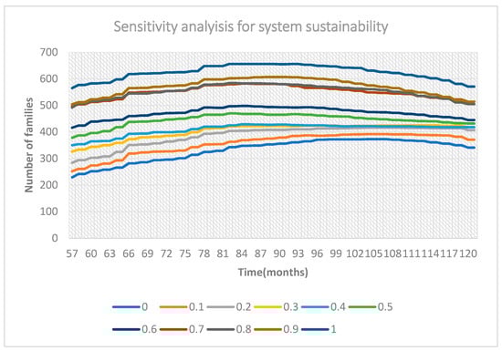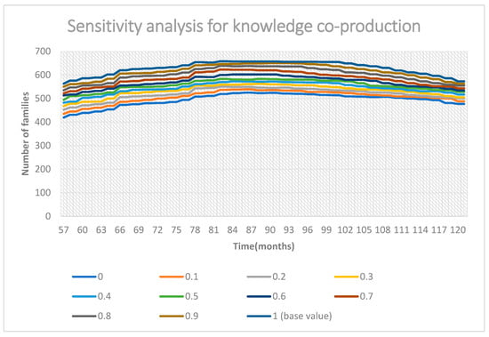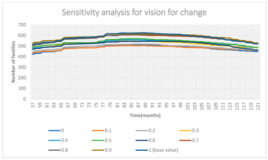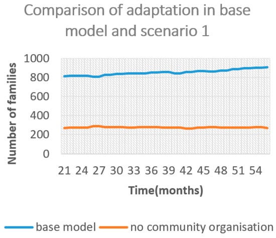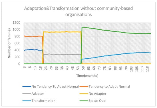 To test the above-written hypothesis, value inputs from the base model were maintained; however, the CBOs and their connections to the family agents were disabled. As a result, the disabled variables of the family agents included the government funding that goes to the CBOs and family agents; the knowledge co-production variable (which represents the creation of innovative ideas and knowledge at the community level); a vision for change variable (which represents the vision of CBOs to bring positive change to the community); and adaptive management (which represents leadership towards adaptation at the community level and within CBOs). The results are shown in Figure 2, Figure 3 and Figure 4.