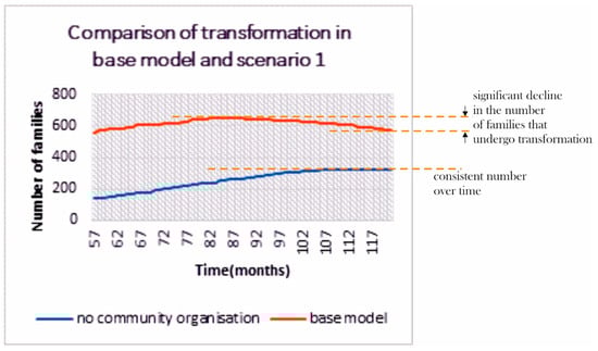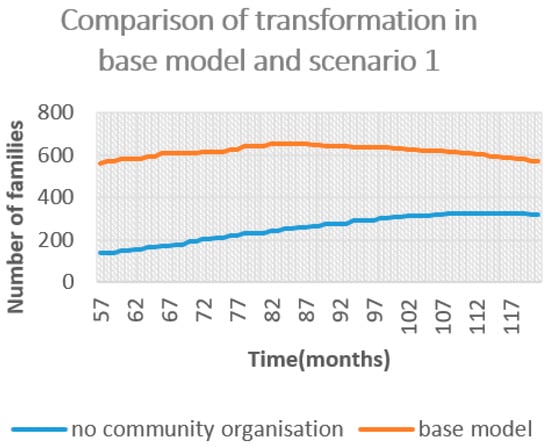 The base model results show an initial increase in the number of families that transition into the new normal state (transformation) followed by a gradual decline in the numbers. An inference can be drawn from this in relation to the complexities of the transformation process. Many factors contribute to the transformation of agents; however, these factors either became unavailable or the agents, CBOs, or governments were unable to sustain the initial momentum observed in the model results.