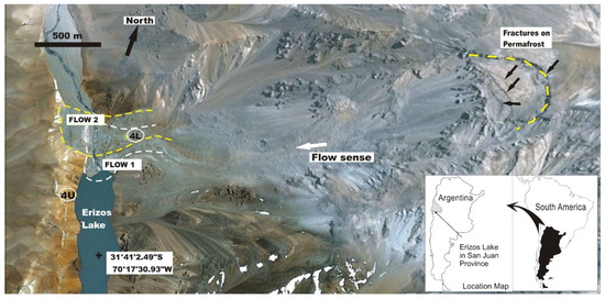 In case of the Erizos Flow 2, the presence of many permafrost blocks or frozen active layer fragments, evidenced by the numerous molards (Figure 8 and Figure 10), indicate that the collapse of a large slab of frozen ground initiated the snow avalanche. Slope instability due to permafrost degradation was investigated by various authors [14,41,46,47,48]. Perhaps the additional load of the snowpack on the soil fostered the collapse, as 2005 was the year with the highest snow precipitation within the last 20 years, as shown by our revision of MODIS/Terra imagery for this area. All evidence indicates that Flow 2 was initiated as a minor landslide and involved a thick snow mantle on the way. Landslides on snowpacks show remarkably large travel distances with low turbulence in the displaced mass, high velocities and momentums and collect snow on their runway, while a small percentage of the total snow content melts due to friction heat [49,50,51]. Snow content increases volume, water content increases entrainment of material from the path of the landslide and snow lowers the basal friction [52]. Schneider [51] investigated the “frictional behavior of granular gravel-ice mixtures” in a laboratory and observed that the bulk friction coefficient linearly decreases with ice content, and that the transformation from a dry granular flow to a debris-flow-like movement occurs when the ice content exceeded 40% by volume. This explains why Flow 2 built lobes in a fashion similar to a debris flow.