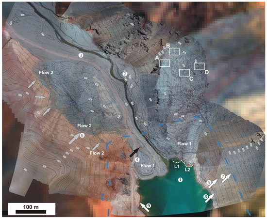 The second difference between our observations and those of Blikra and Nemec [42] relates to the post-depositional alteration. We did not observe any finer-grained deposits developed on top of the debris deposit with stream flow evidence associated with the release of meltwater (Figure 9C), as suggested by those authors. A third difference we found was that the final thickness of Flow 2 exceeded “one boulder or cobble thick” [42]. We ascribe this difference to the landslide origin of Flow 2.