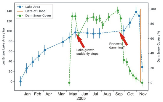Los Erizos Lake area development showing the two-step lake growth, according to LANDSAT satellite images with visible lake perimeter. The percentage of snow cover over the dam complex is added (c. 20 Has), showing the coincidence of the maximum snow coverage and the second stage of lake growth.