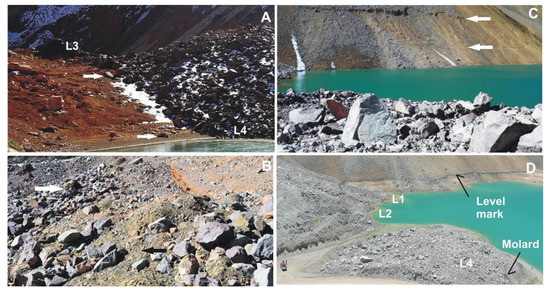 Details of Flow 1 deposit. (A) Distal-preserved front of Flow 1 showing two lobes (L3 and L4) with their frontal slopes and a few outrunners (white arrows). (B) A view of the texture of the deposit showing patches of matrix-rich debris (black arrow), while in other sectors it is almost absent (white arrow). (C) Outlook of the chaotic rocky deposit on top of L3. Largest boulder in the foreground is 1.5 m diameter. (D) Present day drained lake and altered dam showing part of the road and lobes (L1 and L2), also shown in Figure 2. Note the remaining molard and the preserved water level mark created after 16 years of stable lake level.