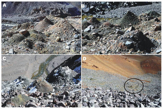 (c) Source: in addition to the angular rock fragments of all sizes up to a maximum of three meters in diameter, some molards were recognized (Figure 7), which imply a minor contribution from ice-cemented permafrost [20,21]. In some cases, these ice-cemented blocks were formed almost directly with the fragmented rocky substrate, so their disintegration did not generate the typical conical molards but were observed as groups of disaggregated rocks that protrude from the deposit.