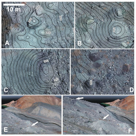 Detailed topography showing the 3D expression of molards. Location of (A–D) are shown in Figure 2. Main contours every 1 m, smaller every 20 cm. (A) Shows a rocky molard (centre of caption) that did not completely degrade into a cone. Note the slope change at the edge of the canyon and the easy identification of molards when they do not show chromatic contrast, as in (D). (B,C) Two of the largest molards that created colluvial microtalus aprons c. 10 m high downslope, and only 2 m up the general slope. (D) Caption at the limit of the survey showing a wide range of colours denoting a mixed composition of molards. (E,F) Virtual recreation of molards using the DEM and the surveyed photomosaic.