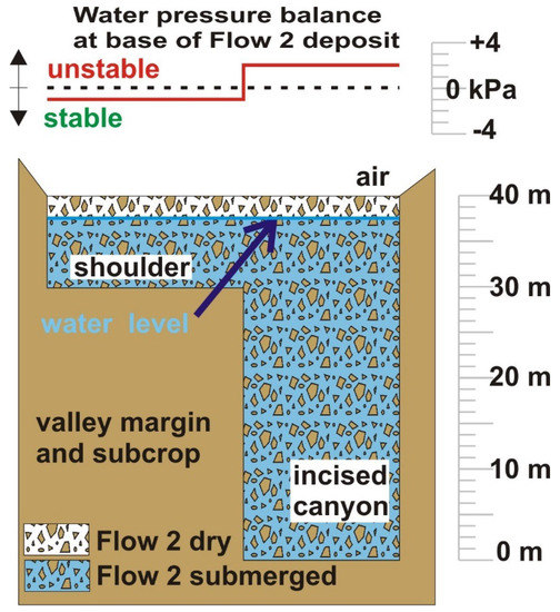 A simplified scenario to portray the uneven distribution of hydrostatic pressure along the base of Flow 2 deposits, due to the pre-existence of the incised canyon. The pressure balance between the dam and water is shown by the upper curve (arbitrary density for the snow avalanche dam of 0.9 g/cm3 was used), showing that the dam over the shoulder is stable, while along the incised canyon the situation is inverse, that dam section would have been floated before reaching the portrayed scenario.