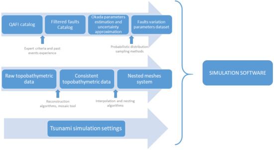In the literature, many authors have employed numerical models to simulate seismic-triggered tsunamis with the aim of gaining knowledge for distinct purposes. Mas et al. [8] designed vulnerability functions for structures using data from the 2004 Sumatra event, launching a single simulation of a six-segment fault. Fragility functions were also developed in the context of aquaculture rafts and eelgrass for the Japan 2011 event [9], involving the running of three different simulations. With respect to economic impact, research for developing loss functions related to marine vessels was also carried out in [10], where one simulation was computed for the 2011 Japan event as well. Pakoksung et al. [11] launched six simulations to estimate the maximum potential damage loss for a hypothetical non-historical event in Okinawa Island. Goda et al. [12] discussed the tsunami risk potential of the strike-slip fault 2018 Sulawesi event, grounding their work in four simulations. Chenthamil et al. [13] predicted the potential run-up and inundation that might occur in a worst-case scenario on the Koodankulam coast, making use of five tsunamigenic events. Their article also contained a preliminary review concerning epicenter sensibility analysis with 28 simulations computed. Probabilistic-oriented studies, termed probabilistic tsunami hazard analysis (PTHA), use several hundreds of computed simulations to provide results with diverse purposes. In [14], structural losses were evaluated by simulating 242 tsunami events with a mesh resolution of 500 m. In [15], a rigorous computational framework was presented to visualize tsunami hazard and risk assessment uncertainty, where 726 simulations were launched for the 2011 Japan event. A more recent study [16] presents a novel PTHA methodology based on the generation of synthetic seismic catalogues and the incorporation of sea-level variation in a Monte Carlo simulation. Its results were derived from 619 simulations, constructed from five faults surrounding the past event in Cádiz, 1755.