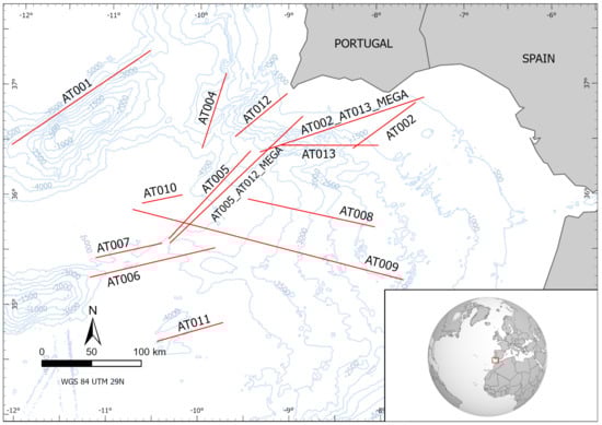 - Martínez-Loriente, S.; Gràcia, E.; Bartolome, R.; Sallarés, V.; Connors, C.; Perea, H.; Lo Iacono, C.; Klaeschen, D.; Terrinha, P.; Dañobeitia, J.J.; et al. Active deformation in old oceanic lithosphere and significance for earthquake hazard: Seismic imaging of the Coral Patch Ridge area and neighboring abyssal plains (SW Iberian Margin). Geochem. Geophys. Geosyst. 2013, 14, 2206–2231. [Google Scholar] [CrossRef]