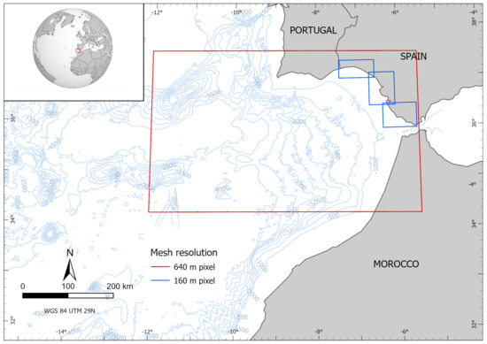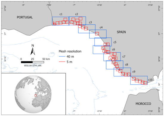 A set of four levels of nested meshes was considered to carry out the present inundation study at very high resolution along the Andalusian Atlantic coast. The computational domain is covered by the ambient mesh with a numerical resolution of 640 m per pixel, spanning from 34.28° N to 37.49° N and from 12.05° W to 5.5° W. Next, three levels of grids were nested, considering 3 meshes of 160 m pixel resolution, 10 meshes of 40 m pixel resolution and 43 meshes of 5 m pixel resolution that finally shaped the coverage of all areas of interest at high resolution. Figure 3 and Figure 4 show spatial configuration of the meshes. The areas not covered by the highest resolution meshes did not contain sufficient elements of interest for the purposes of this study, but should be included in future revisions if further urbanisation were to be undertaken.