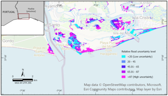 where i accounts for the number of times the pixel has been wet and n is the number of fault variants (). Figure 5 and Figure 6 show the results obtained. Figure 5 displays the relative flood uncertainty behaviour with respect to the 64 variants of fault AT013 inside the 40 m grid termed as c1. It is remarkable how the areas surrounding the diverse rivers are prone to be flooded, with flood uncertainty increasing as we move away from the river courses, in contrast to the poor penetration found through Playa de Bruno and Playa Punta del Moral, which display high levels of uncertainty. Although that is not the case for the beach on the far right side region.