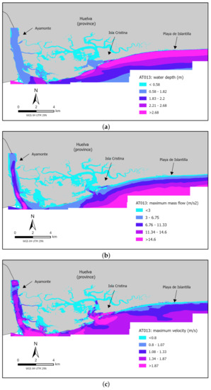 Spatial representation of results obtained for the 5m sub-grids inside the 40 m-grid c1 due to variant 37 of fault AT013 for maximum water depth (a) maximum velocity (b) and maximum mass flow (c).