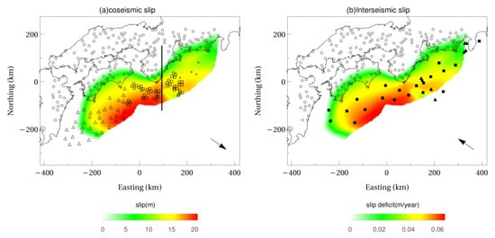 in the estimation of the coseismic slip distribution. The estimated mean of the interseismic slip-deficit distribution shown in