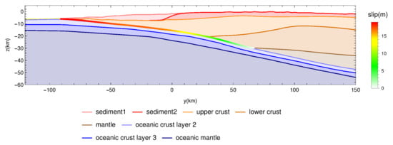Figure 3 shows the amount of fault slip and the position of each layer in a specific cross-section. Sedimentary layer 1 and upper and lower crusts are distributed just above the fault plane where the large slip occurs in the reference slip distribution; thus, the result of inversion is assumed to be sensitive to the properties of these two layers. It should be noted that most of fault slip area is in contact with the upper crust (