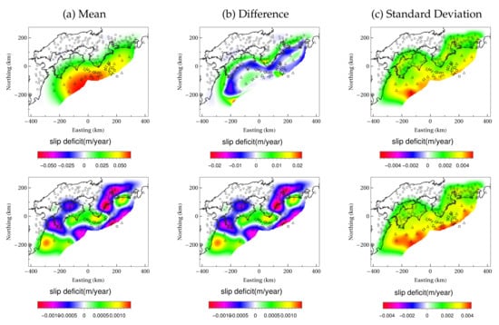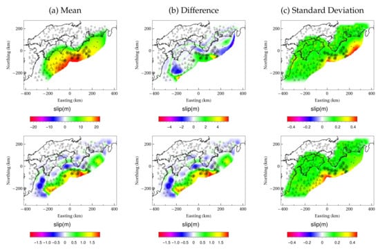 Figure 6 has a smoother distribution, and the error is mainly in the low-frequency components. The standard deviation tends to be large in areas near the trench axis with a large slip.