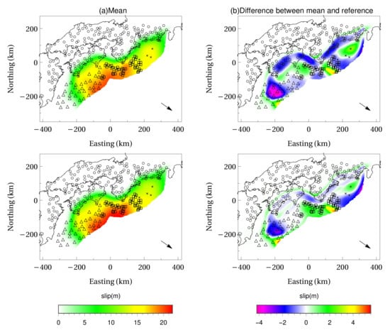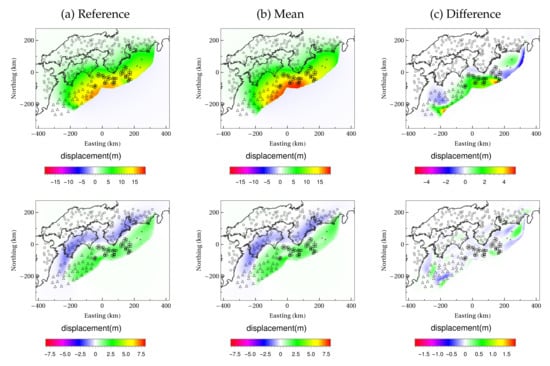 Figure 5 shows the ground surface displacement distribution predicted from the mean of the estimated coseismic slip distribution. As horizontal displacement cannot be observed in real-time seafloor observation systems, large differences of 4.30 m and 1.51 m occur in the