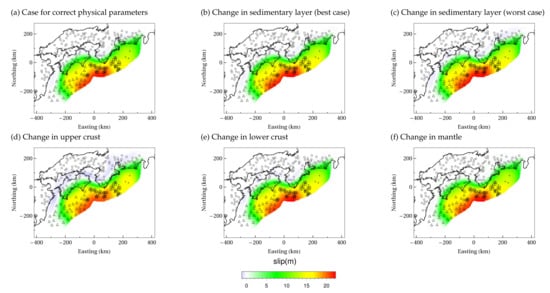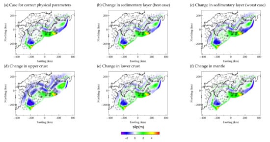 Figure 12a). In contrast, when the physical property values of the upper crust were changed, the model parameter in which the negative slip had occurred was suppressed to zero, and the range of slip distribution was more accurately estimated (