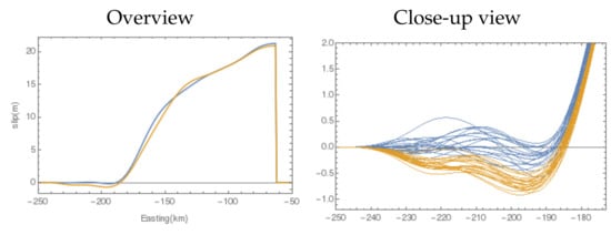 Figure 12b). However, the relative error increased to 0.142 from the relative error of 0.127 in the case without the non-negative constraints. This confirms that the model error is the reason why the negative slip did not disappear even if the sparse constraint was introduced. From the above, we can assume that the physical properties of the crustal structure model may be set incorrectly if a negative slip is estimated in actual data analysis, as negative slip is not anticipated in an actual coseismic slip. Therefore, we can expect improvement in the estimation accuracy of physical properties by estimating the slip (without non-negative constraints) using Green’s functions of models with varying material properties within the permissible range, and selecting the physical property value that results in non-negative slip.