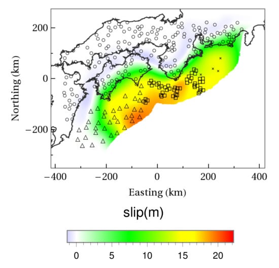 19], the virtual Nankai Trough coseismic slip and interseismic slip deficit are set. However, it is moved so that the slip reaches the trench axis, and the slip amount is set to 0 at regions where the unit fault is undefined. The coseismic slip is set to the opposite direction of the plate’s subduction. The reference interseismic slip deficit distribution is set in the opposite direction of the coseismic slip based on Hyodo and Hori [