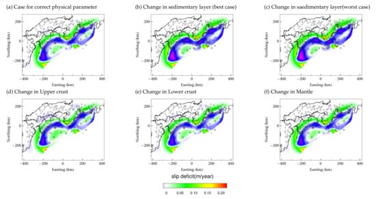 Table 3). The interseismic slip deficit distribution also shows similar results regardless of changes in the physical property values of any layer (
