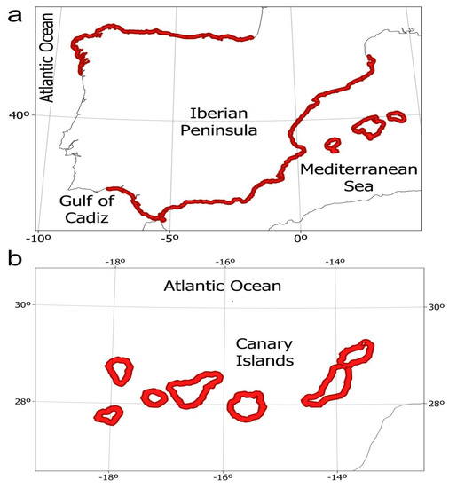Map of tsunami alert zones (red polygons) to disseminate tsunami warnings to Civil Protection by the Spanish TWS. (a) Shows tsunami alert zones in the Iberian peninsula and vicinity, and (b) in the Canary islands.
