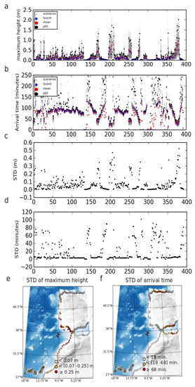 Results from the ATL domain reached 2.5 m for the maximum height and 240 min for the arrival time when all FCPs and scenarios were considered (Figure 4). The standard deviation ranged from 0 to 0.5 m for the maximum height and from 0 to 100 min for the arrival time. The geographic distribution of FCPs with more variability differed from tsunami maximum height and arrival time results (Figure 4e,f). FCPs that show larger variability in maximum height were located along the closest coastal segments to the tsunami source, at the southwest of the Iberian peninsula, west of Africa, and north of the Canary Islands. On the contrary, FCPs with larger arrival time standard deviation are located far away from the sources, at the northern Atlantic coast, the Mediterranean, and the southern Canary Islands coasts. This is probably because the tsunami effect is low at these locations and its arrival time estimation is more difficult to precisely define.