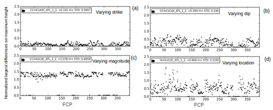 Black dots indicate normalized largest differences of maximum height in FCPs for cases corresponding to scenarios where one source parameter takes different values in the range defined in this study from the scenario of reference: varying (a) strike, (b) dip, (c) magnitude and (d) location.