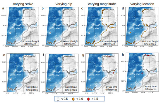 Geographic distribution of normalized largest differences in maximum height and arrival time for the same cases as in Figure 5, varying one source parameter from the reference scenario. (a,e) Differences between cases in which the strike is varied; (b,f) the dip is varied; (c,g) the magnitude is varied; (d,h) the location is varied. The differences are normalized with respect to the values of the reference scenario. The color of the circles indicates the ratio between the largest differences for each case and the values of the reference scenario in each FCP.