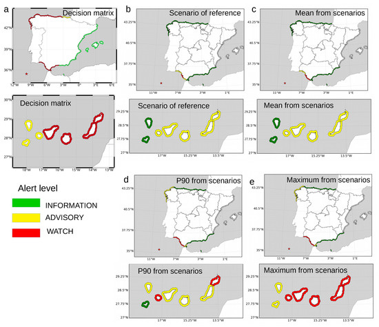 Tsunami warning maps obtained from the maximum tsunami height at close-to-the-coast FCPs computed with the (a) decision matrix, (b) scenario of reference, (c) mean, (d) 90th percentile, and (e) maximum of all 135 scenario results, computed at 1/2 arcmin domain resolution.